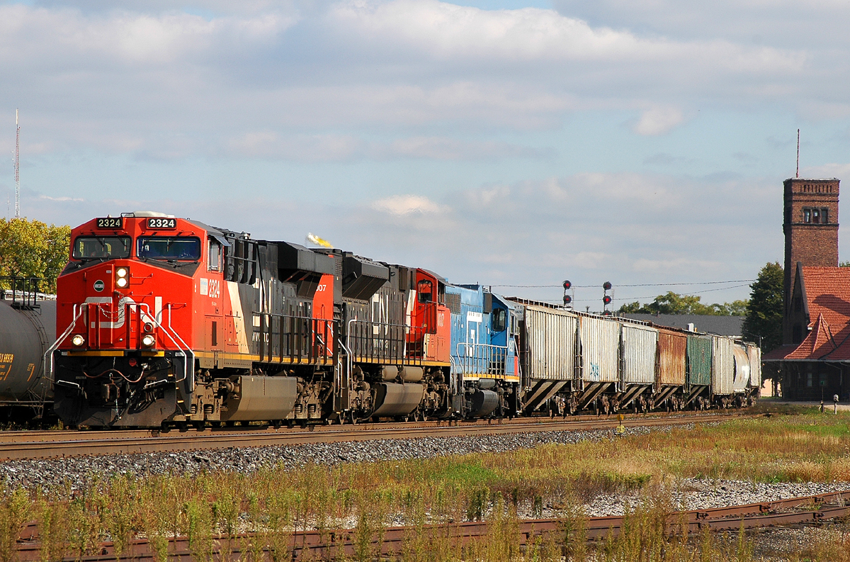 Thanksgiving monday's 435 makes it's way past Brantford with CN 2324 - CN 8807 - GTW 4927. They will have a setoff at Paris today