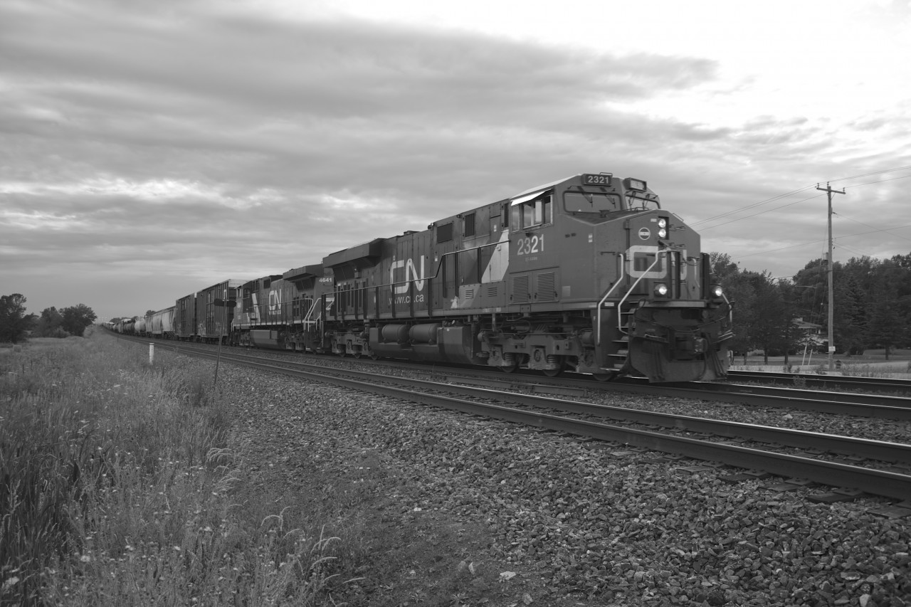 CN 2321 with CN 4641 makes a slow climb from the Belleville Yard and heads eastbound on the newly triple tracked Belleville to Kingston Subdivision. This shot taken from Airport Pkwy and Mitchell Crossroad crossing, looks back nearly a mile.