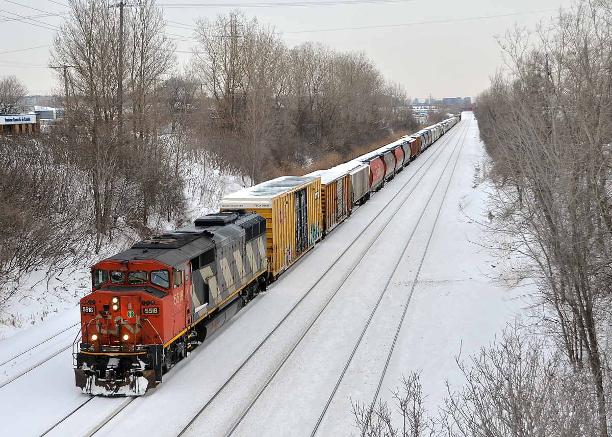 A solo cowl unit. CN 527 with CN 5518 solo is about to enter Taschereau Yard.