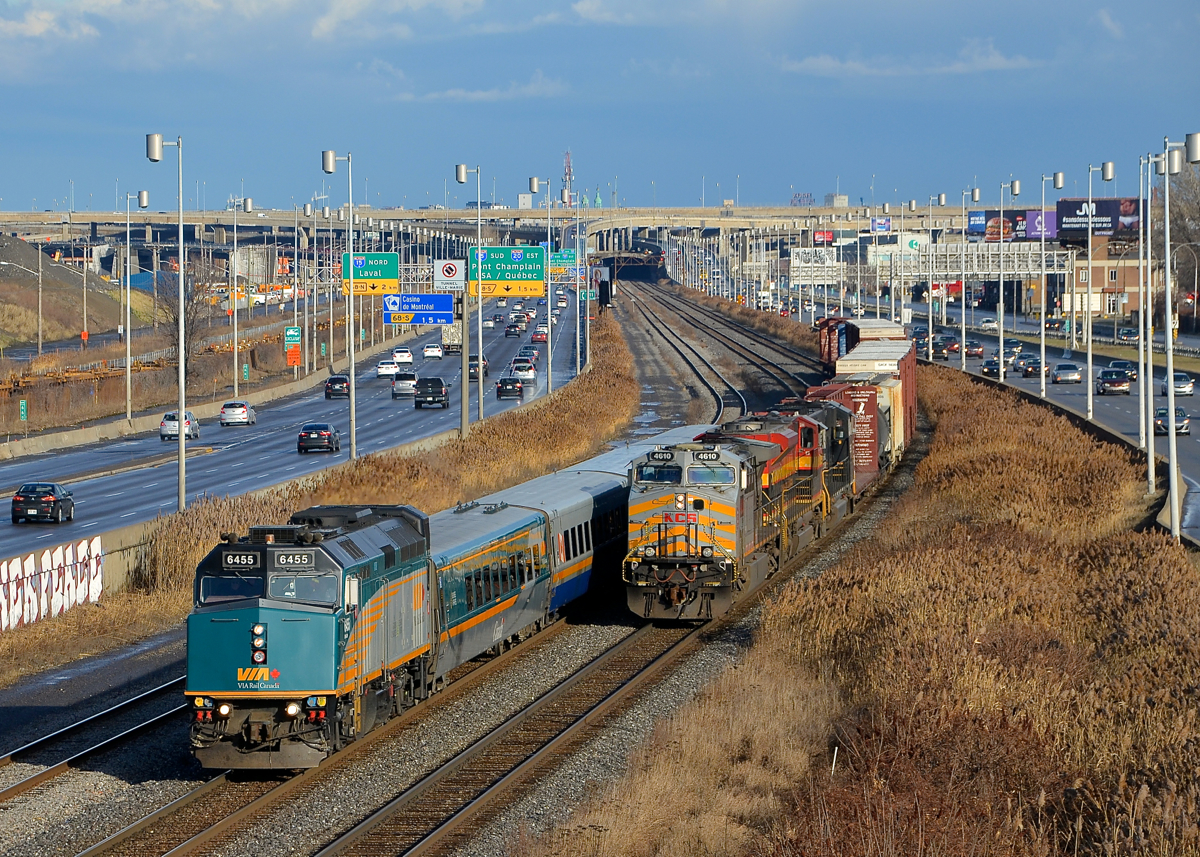 Caption: A rare VIA/KCS meet. With Kansas City Southern not operating anywhere near routes used by VIA Rail, it's not everyday you see a KCS engine meeting a VIA one. Here CN 529 with two KCS engines up front (KCS 4610 & KCS 4147, with NS 6923 last) is stopped as VIA 55 passes it, led by VIA 6455. CN 529 originates on Norfolk Southern tracks as NS 31T and becomes CP 931 when interchanged to CP. CN picks it up at Rouses Point where it becomes CN 529.