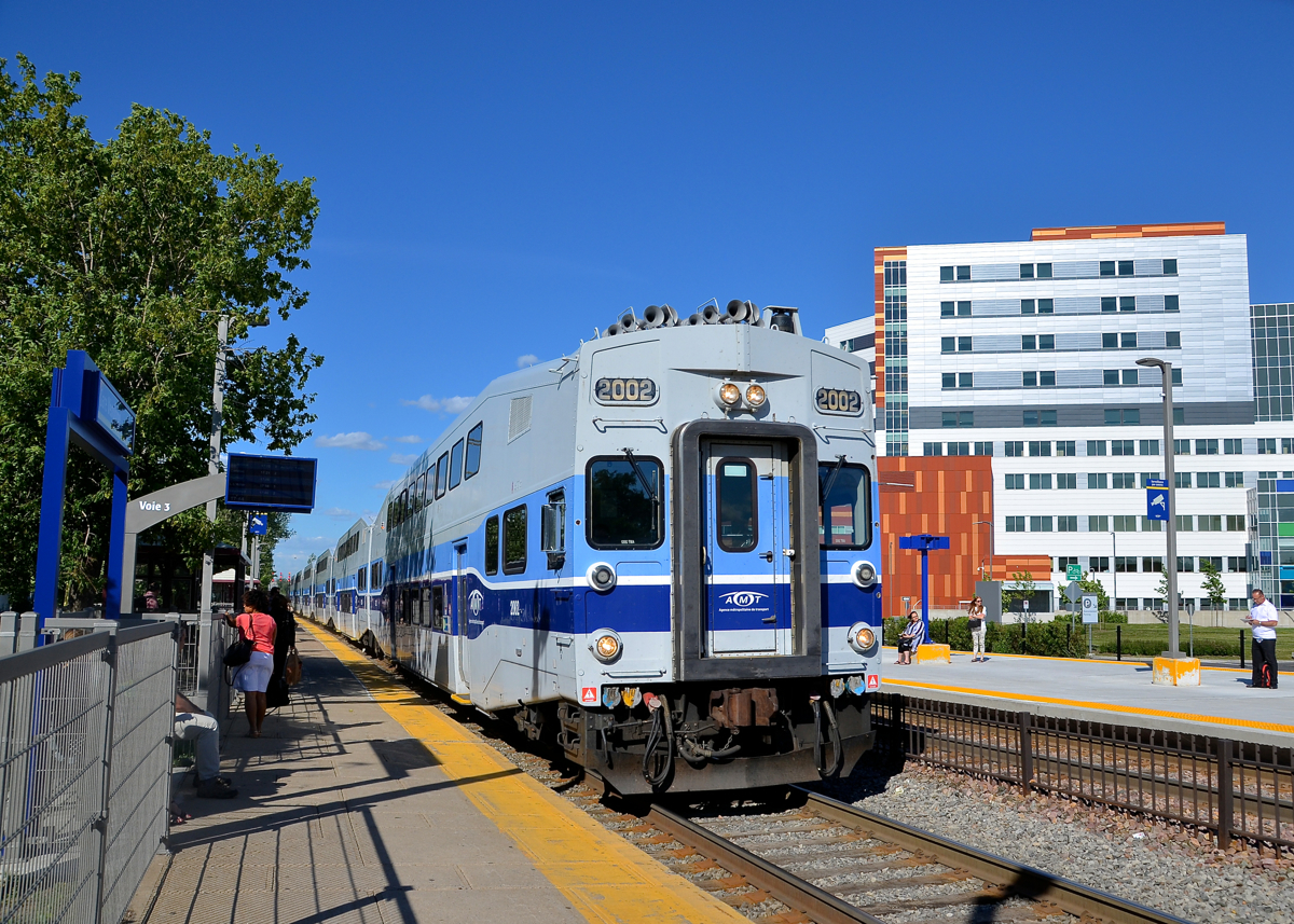 Caption: Past the 'superhospital'. Cab car AMT 2002 leads AMT 187 (bound for Saint-Jérôme) towards its first stop at Vendôme Station. To the right of the train is the recently opened McGill University Health Centre, dubbed the superhospital locally. It was built on the site of CP's Glen Yard.