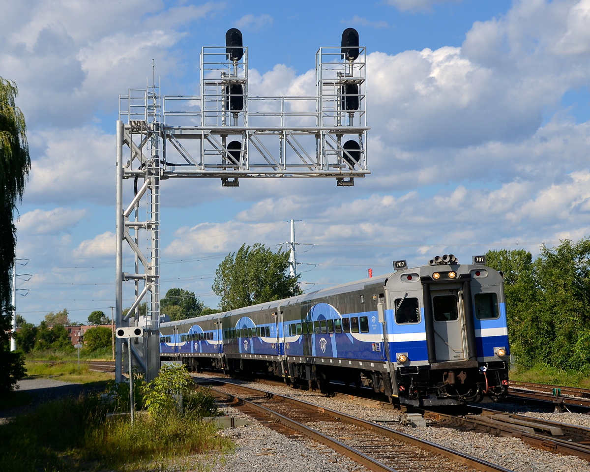 AMT 75 passes under a fairly new signal gantry as it approaches its next stop at Lasalle station with cab car AMT 707 leading.