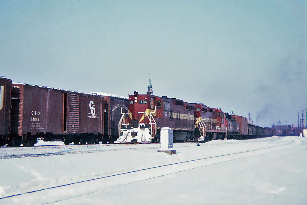 Caption: Two Duluth, Missabe and Iron Range SD9's exemplify some of the diverse, leased power that worked both the CN and CP during the mid-60"s.Number 104 and sister 152 work west with an extra at Montreal in February 1965.