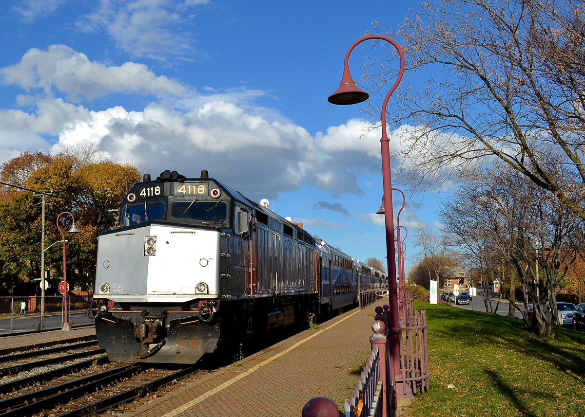F40PH-2CAT AMT 4118 was a New Jersey Transit unit (same number on NJT) on long term lease to the AMT. It is seen pushing a deadhead train eastwards through Montreal West.