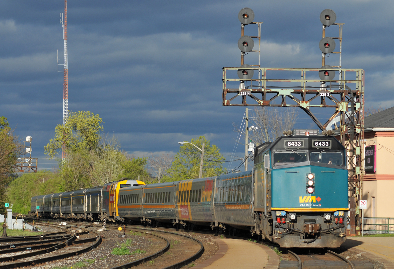 Caption: VIA 75 arriving at Brantford for its station stop with F40PH 6433, 4 LRC's, P42DC 900, and a baggage car/6 stainless steel coaches to be used on 82 the next morning