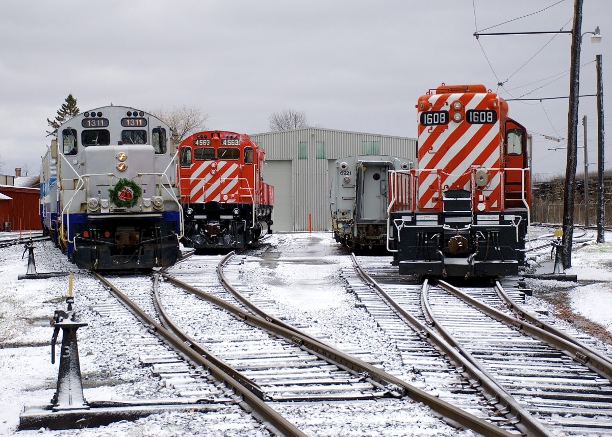 Caption: Exporail's Christmas Train (with a rare all-AMT consist of GP9 AMT 1311, generator car AMT 603 and coach AMT 827) approaches Hays Station to pick up another round of passengers. At right is M-636 CP 4563, LRC-3 VIA 6921 and GP9 CP 1608.