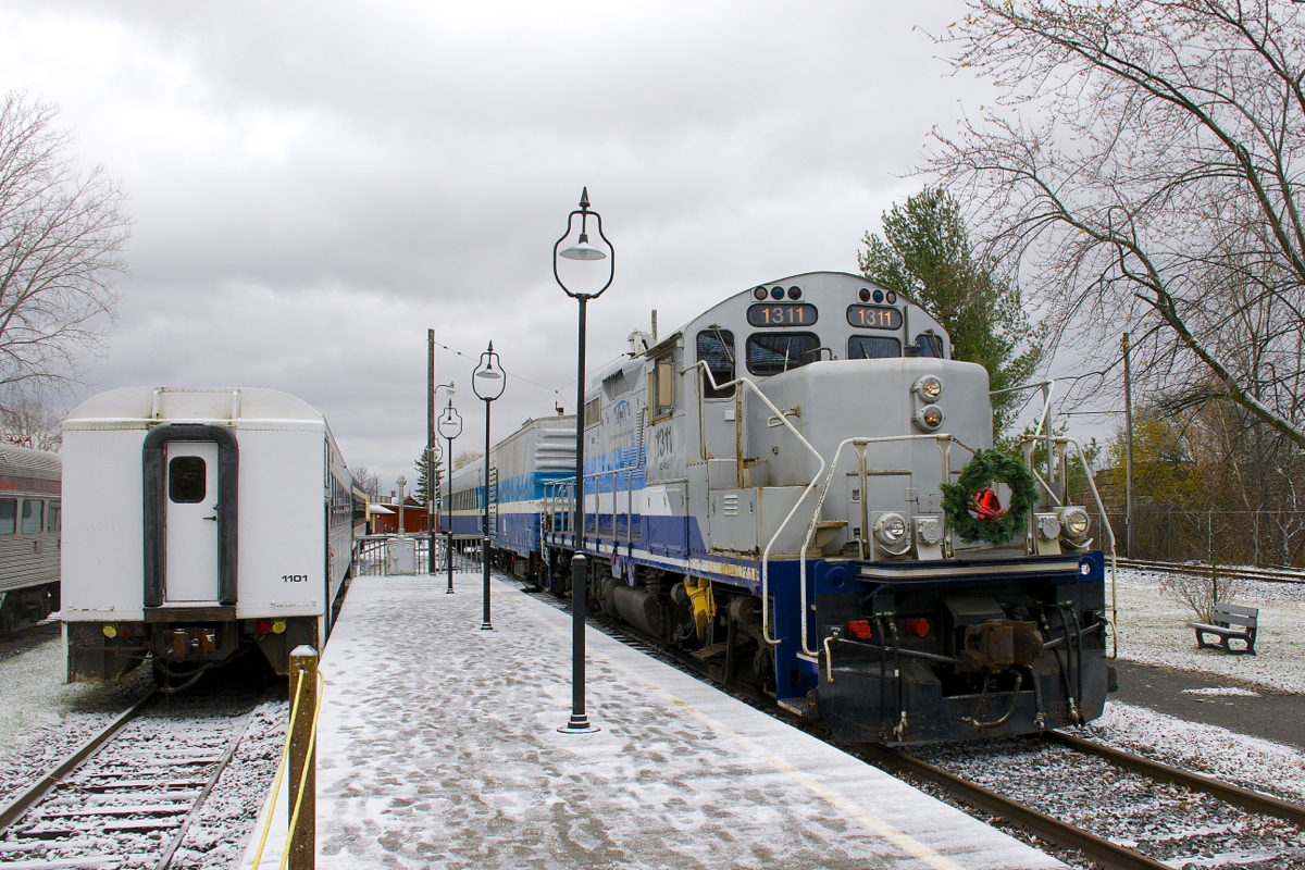 Caption: Exporail's Christmas Train (with a rare all-AMT consist of GP9 AMT 1311, generator car AMT 603 and coach AMT 827) approaches Hays Station to pick up another round of passengers. At left is coach AMT 1101.