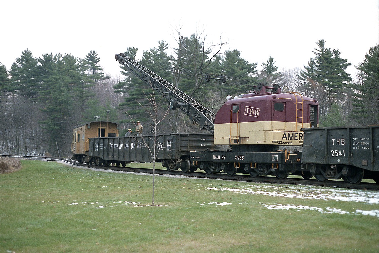 Fabulous photo Arnold! TH&B X-755 was an American model 830 DE (diesel electric) locomotive crane with serial number J-3066, built in 1952. It was later renumbered to CP 414226 and has since been scrapped.