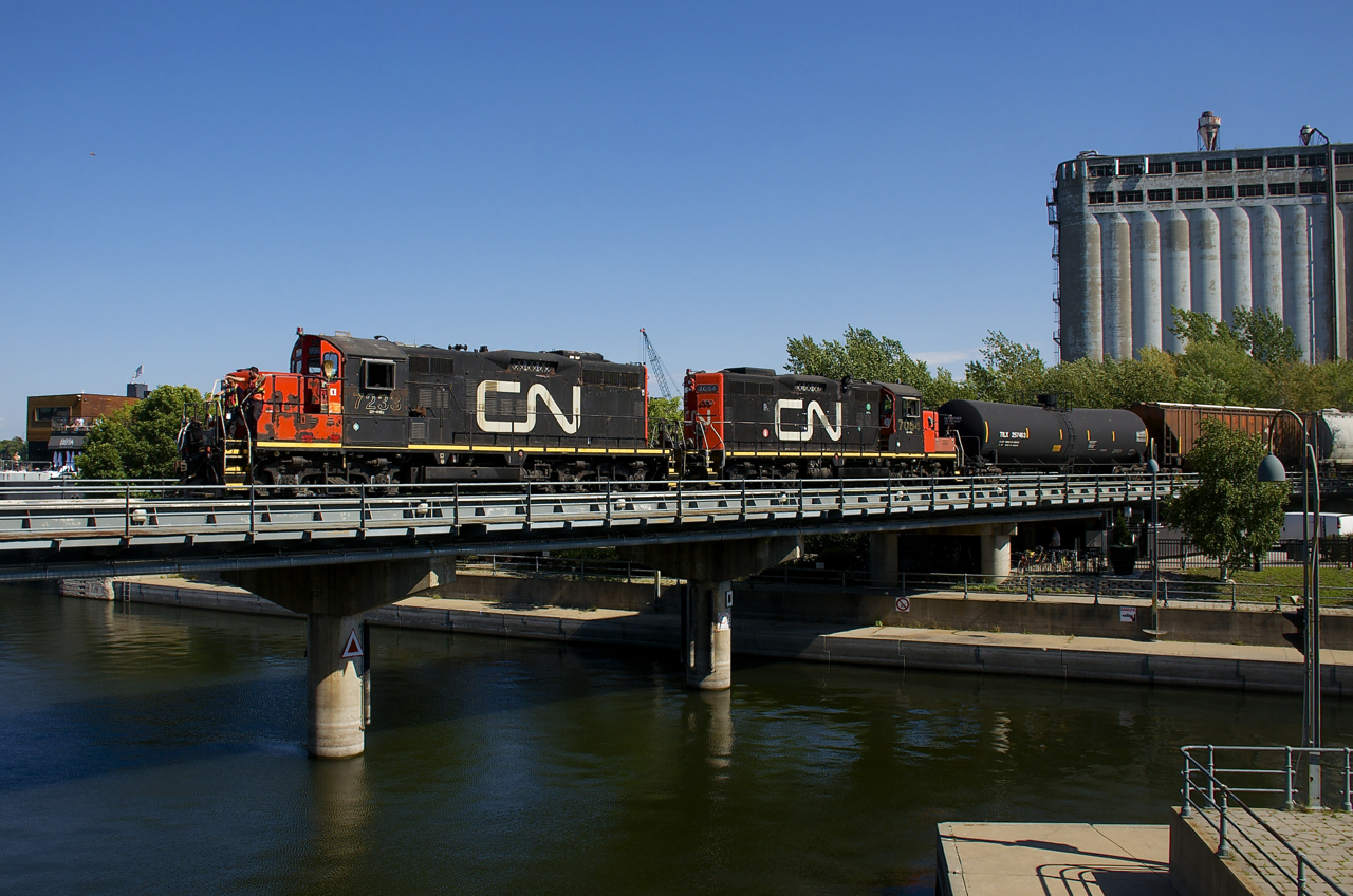 Caption: GP9's in matching paint schemes (CN 7233 & CN 7054) lead a transfer into the Port of Montreal, with two crewmembers on the nose of the lead unit.