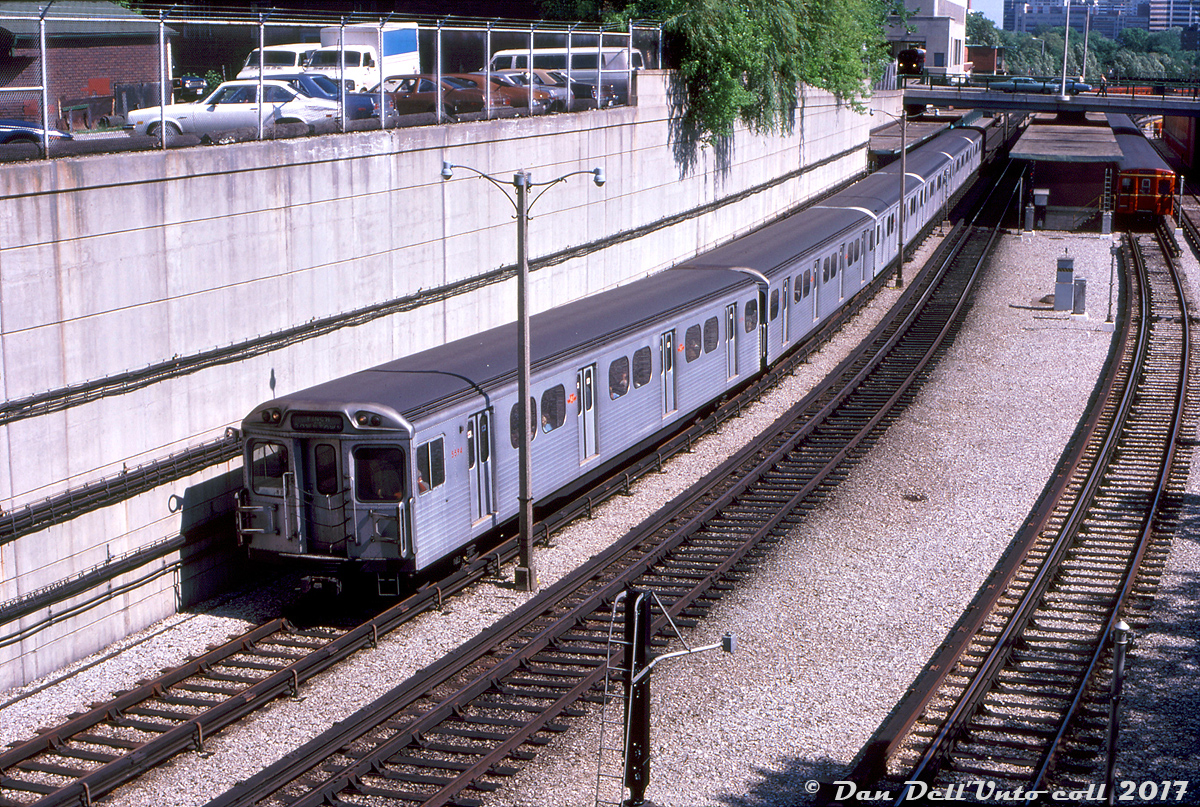 Caption: TTC H4 5594 (relatively new at the time, built by Hawker Siddeley Canada in 1974/75) leads a mixed train of H4's and four older H-series cars northbound out of Davisville Subway Station on the Yonge subway line, bound for Finch. An old Gloucester "G" train is sitting on platform 3, possibly waiting to enter service for PM rush hours, and a TTC bus (likely a GM fishbowl) is visible laying over in the bus bays of Davisville station. The lead car 5594 upon its retirement was converted into work car RT-64, and appears to still be on the roster.