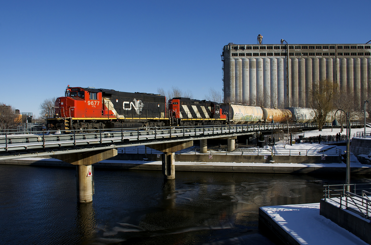 Caption: CN 9677 & CN 4115 are doing some switching in front of grain elevator #5 on a cold afternoon.
