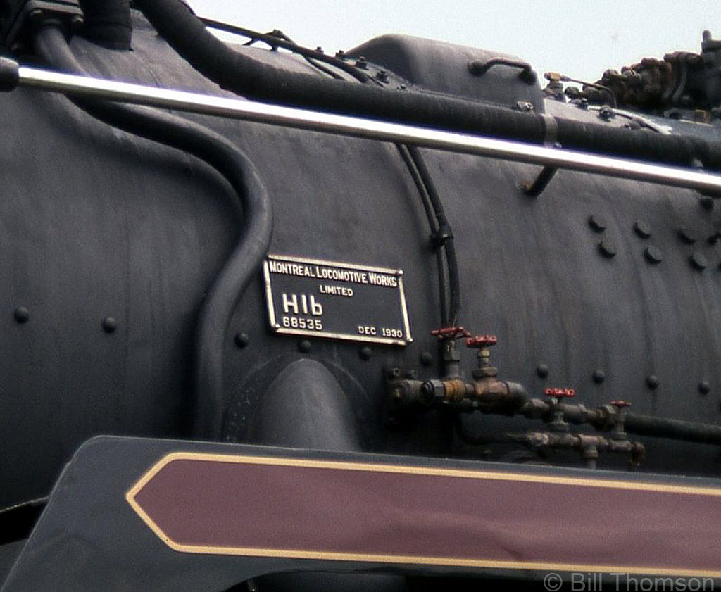 Caption: A closeup of the builder's plate bolted on the front left side of CPR Hudson 2816's boiler, proudly proclaiming her as a December 1930 product of the Montreal Locomotive Works, builder's number 68535, and CPR class "H1b" Hudson.