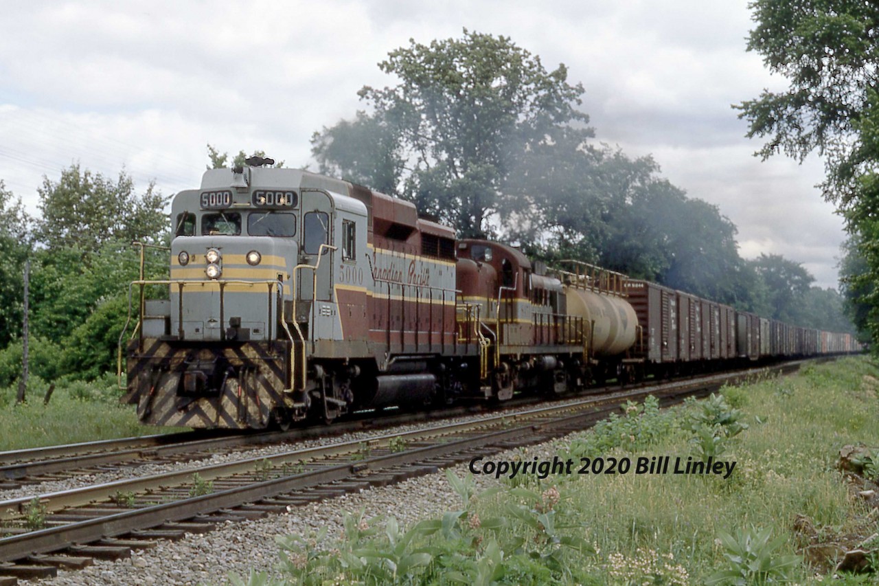 Caption: CPR 5000, Canada's first, of two, was built in London, Ontario, in March 1963. It was delivered as 8200 and renumbered in April 1965. The 8200 was GM's first sale of a turbo-charged, second-generation unit in Canada. Trade-in for the two units was provided by F9B 1902 and F7B 1910. A runoff of Train 8, the Dominion, near St-Eugene, Ontario, on Sunday, January 7, 1962, had wrecked the B units. The lead unit in the wreck, RS-10 8474, provided trade-in credit for the first-ever C-424, CP 8300.