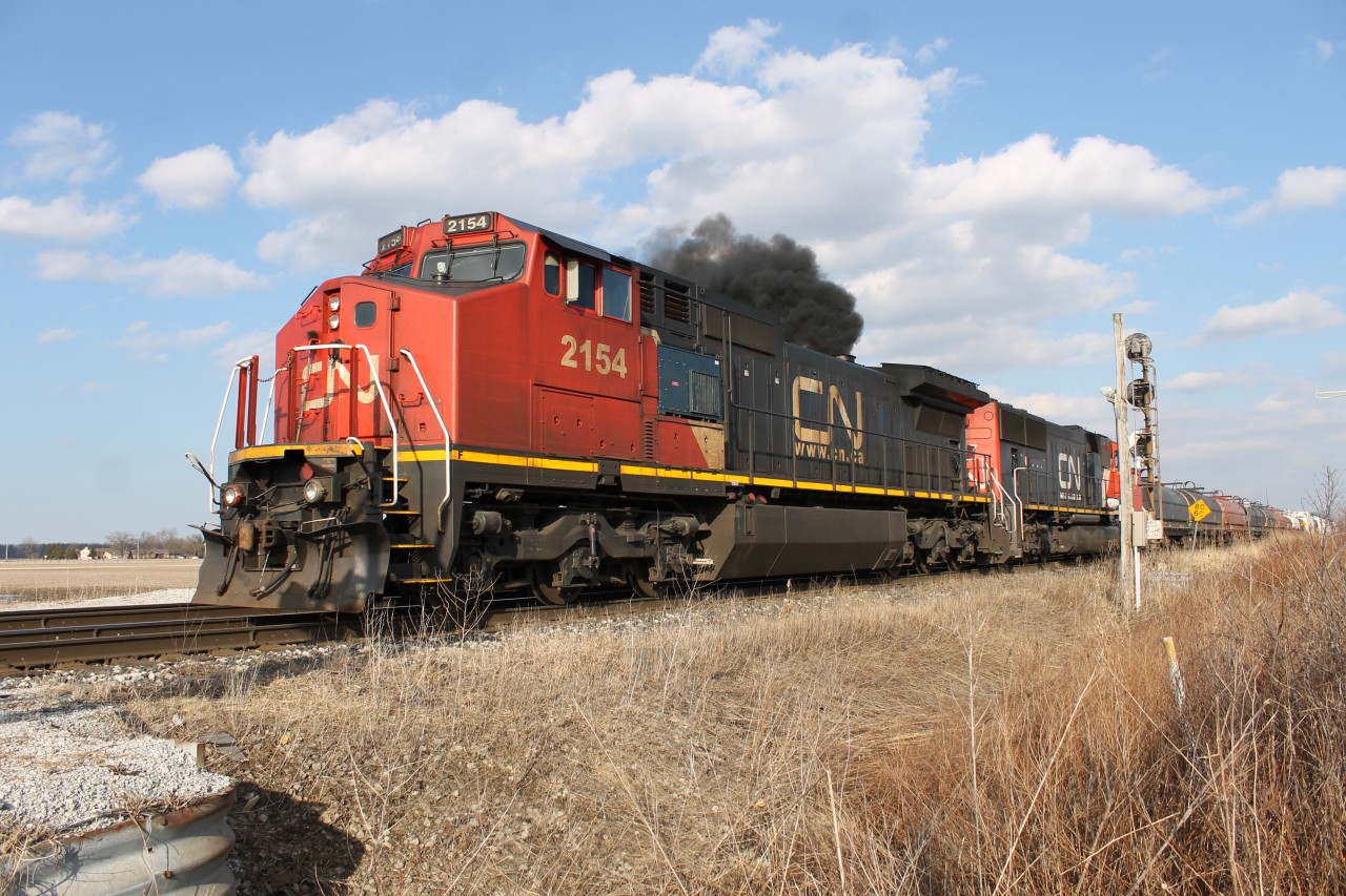 After CN M398 was done making their lift and backed up into the yard, CN M331 had their light at Blackwell to proceed into the yard with CN 2154 filling the blue skies with black smoke.