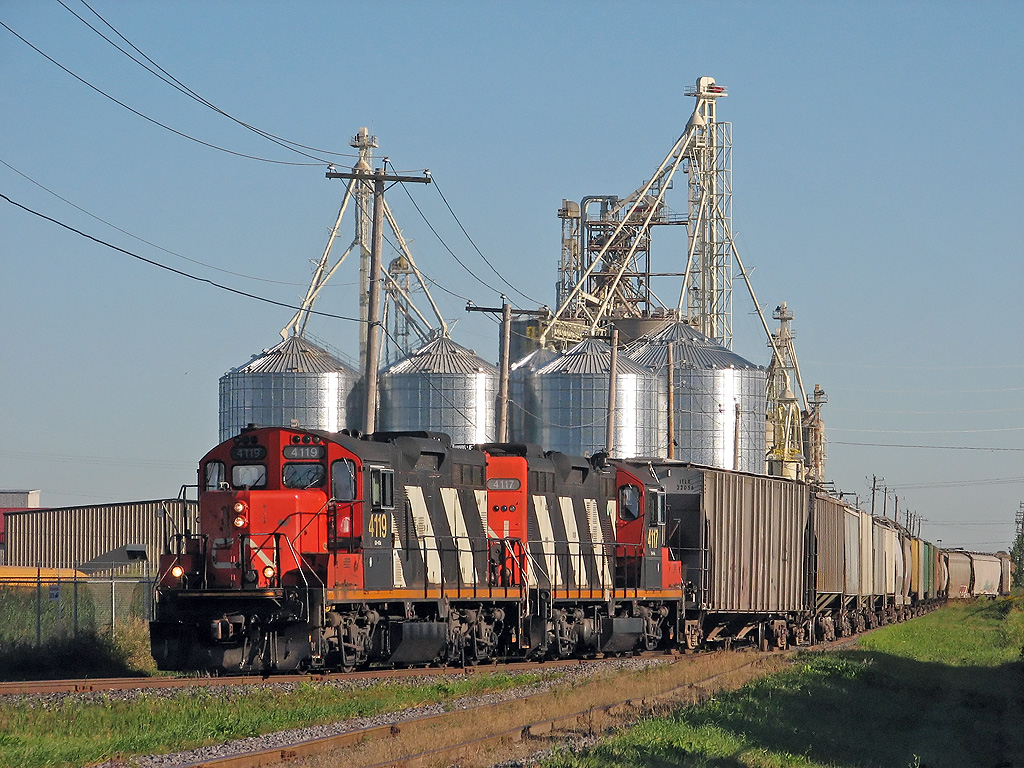 CN 525, with a nice pair of zebra GP9rm is switching the NovaGrain tracks.