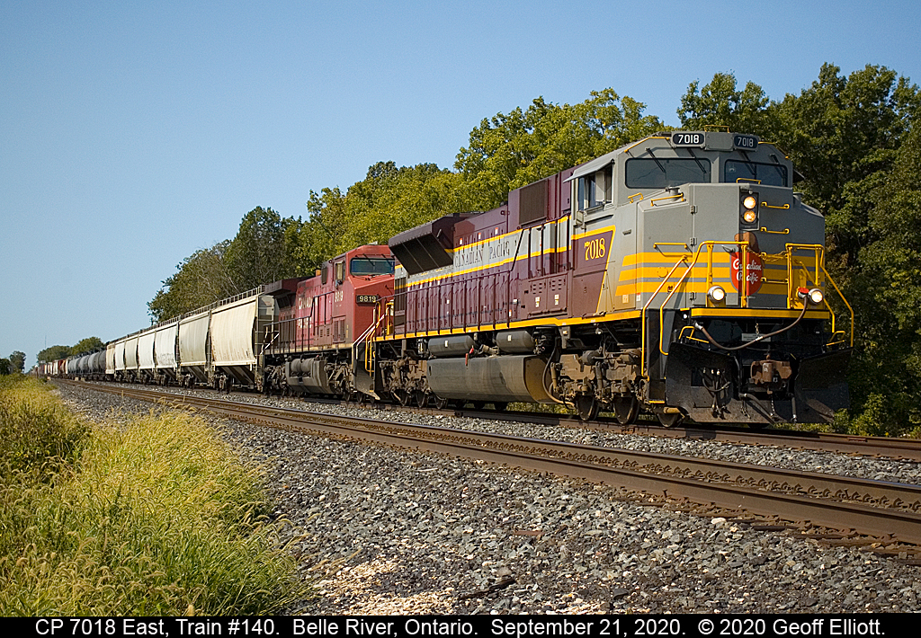 Caption: "Block Party" of sorts. CP 7018, in it's block CP Heritage scheme, leads Train #140 into the siding in Belle River, Ontario to wait on westbound CP 8101, Train #235. This is the first decent shot of a block lettered unit I've been able to nab as they always seem to going the wrong way for the light. Nice catch for the day.