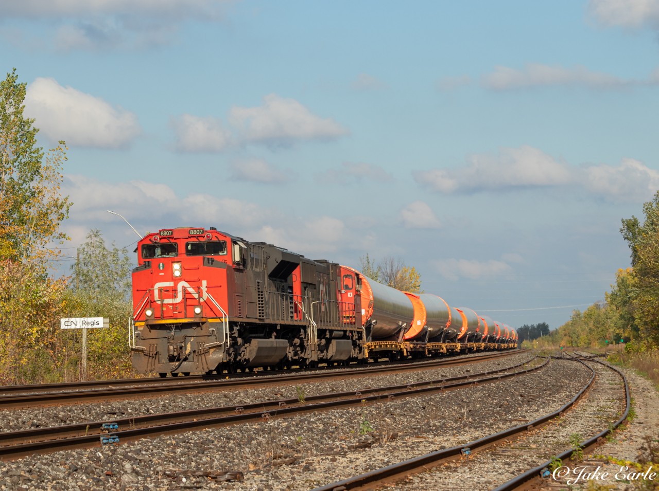 CN X319 comes by the station sign at Regis, with CN 8807 and CN 5733 hauling windmill tower parts headed for the states.