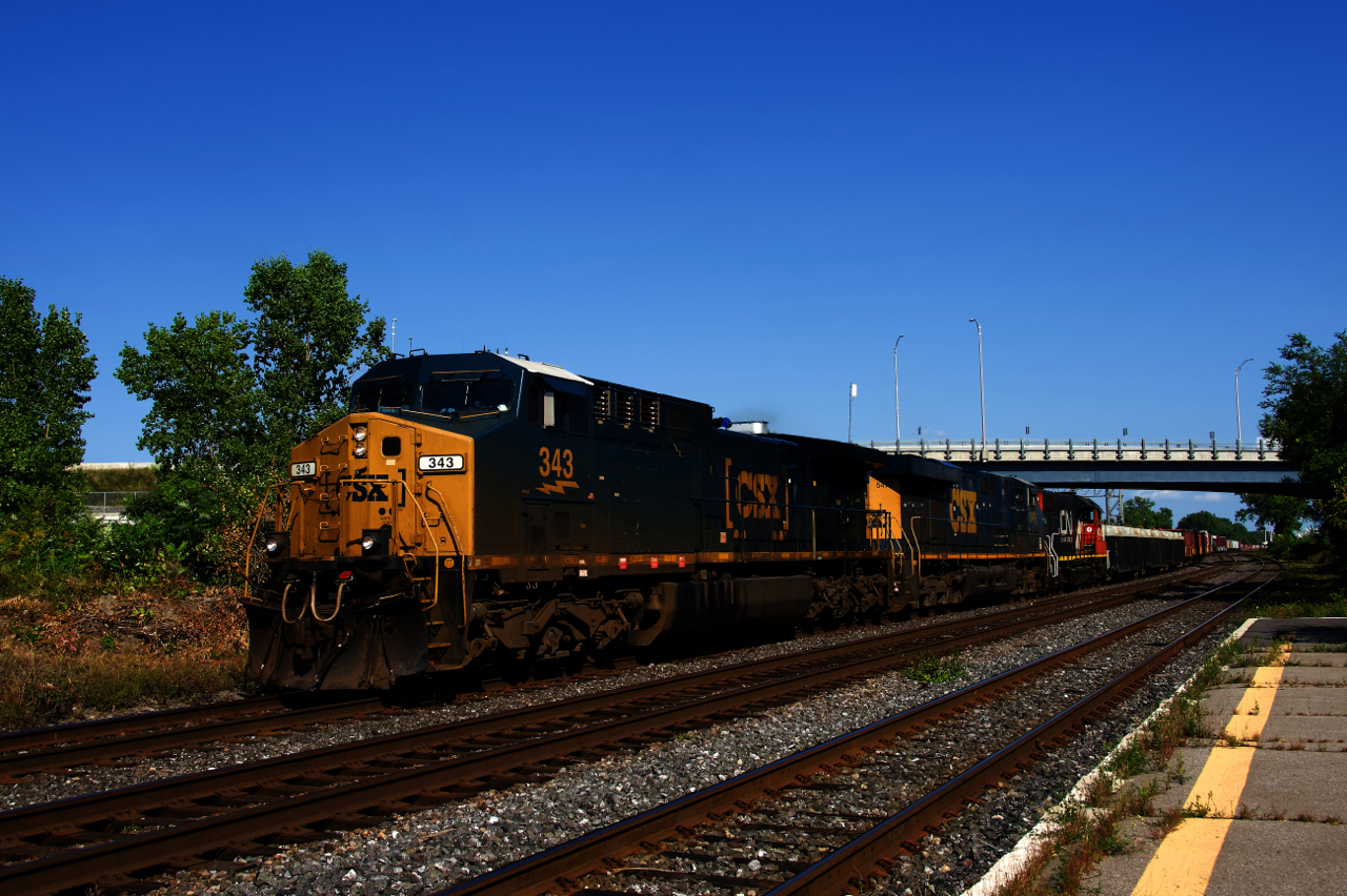 CN 327 is passing through Dorval with CSXT 343, CSXT 5479, CN 4700 and 113 cars.