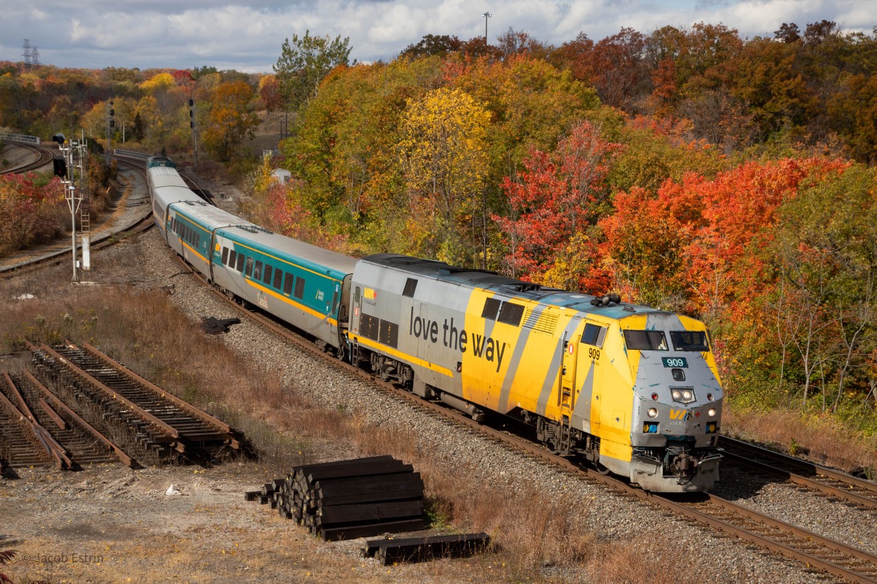 Caption: VIA 72 seen passing some fall colours in Hamilton.