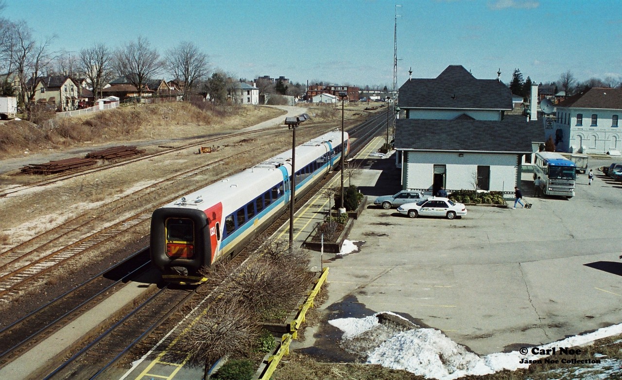 Caption: In September 1996, VIA Rail had launched the testing of two IC3 Flexliner demonstrator sets on some of their routes throughout Ontario. These new units were designed and built by ADtranz, which was a new company spin-off created from ABB and Daimler-Benz. These two trainsets entered revenue service on September 29, as it was concurrent with the release of the new VIA Rail system timetable that touted the trains as a “commuter service.” However, just as quickly as they began service they were removed on September 30 as they were found to not be reliably activating track circuitry due to their light weight. Eventually, after 7 weeks of further testing and modifications they were deemed fit to return to service where they operated on assignments from Toronto to Ottawa, Stratford, London and Niagara Falls in various schedule rotations. One set would operate until March 1997 and the other stopped running in early May. In the end, the tests were reportedly not successful and VIA Rail felt the technology would not “fit their needs.” Here, one of the sets is seen stopped at the Woodstock station on the CN Dundas Subdivision with not many passengers around as it heads eastbound from London.