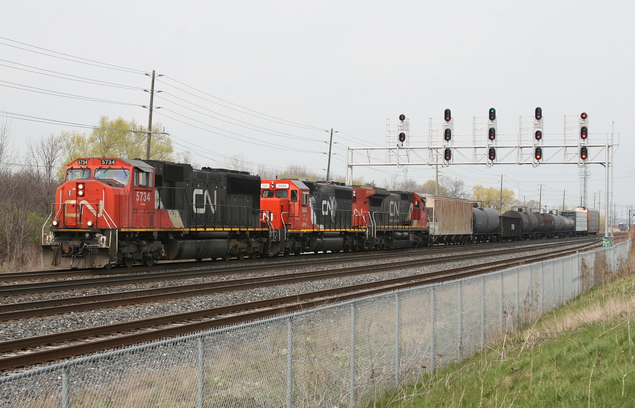 Caption: CN 435 arrives at Oakville to set out 9 cars with CN 5734, GTW 5934 and CN 2134