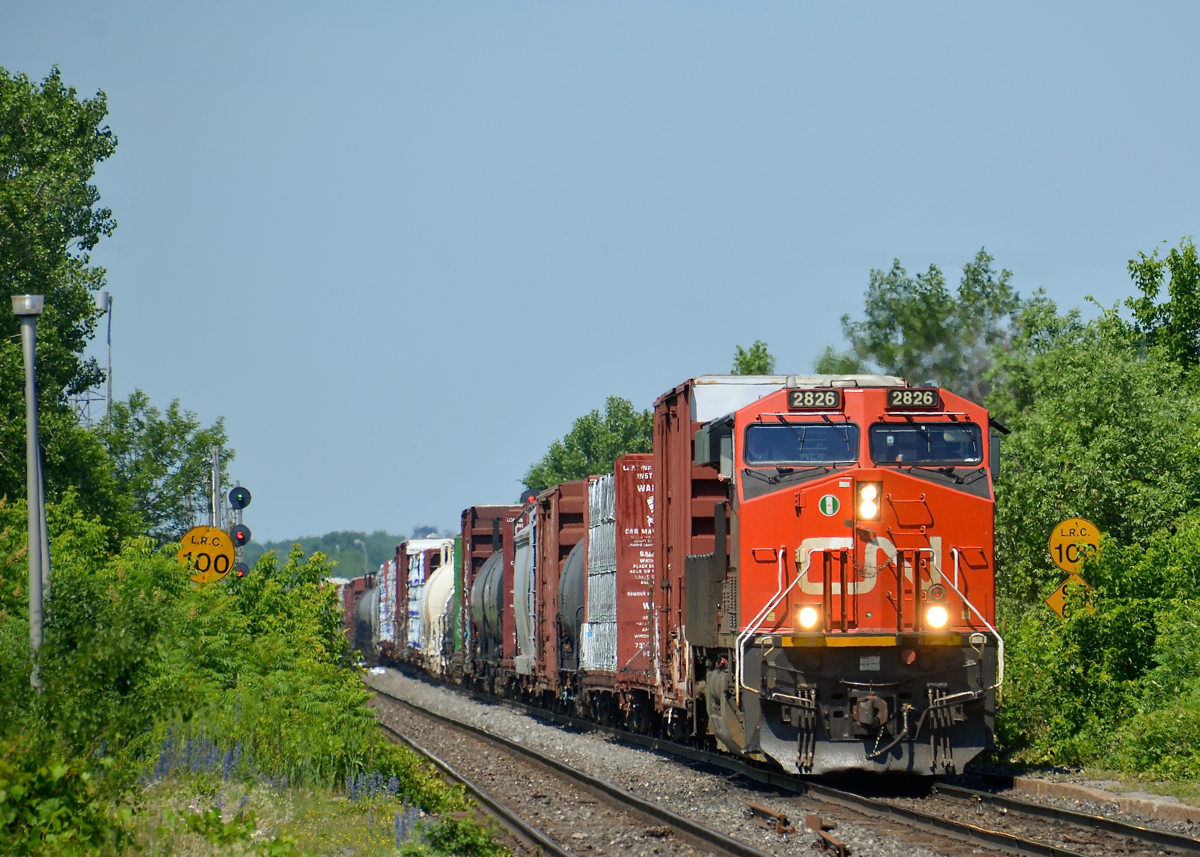 CN 2826 leads CN 368 past the speed limit signs at Dorval, which are partially obscured by growth. Operating mid-train is CN 2857.