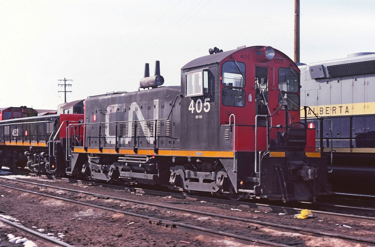 Caption: CN 405 basking in the sunlight at Calder Diesel Shops. Cute little units.