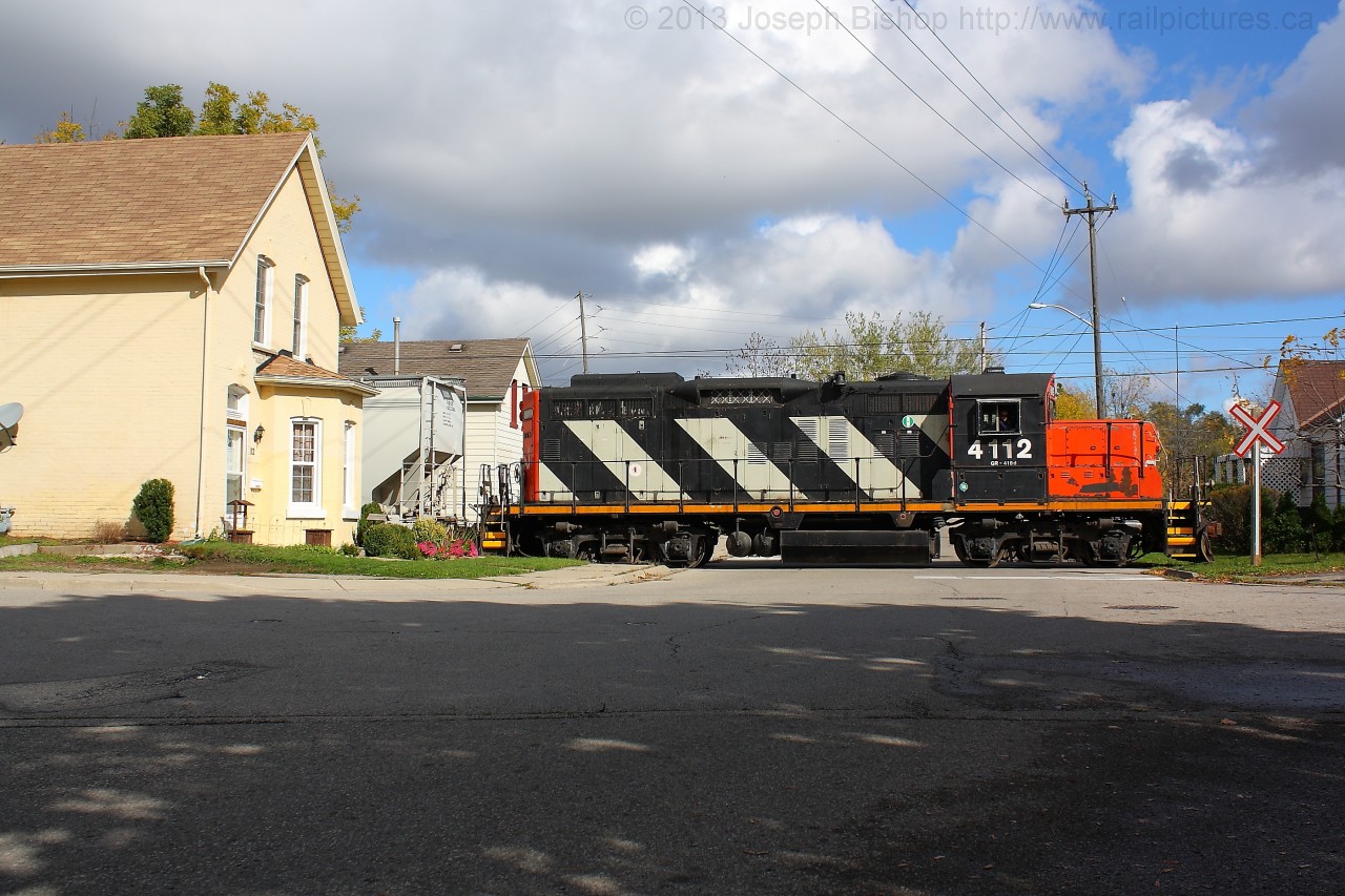 Caption: CN 4112 rolls past the houses on Port Street along the CN Burford Spur.