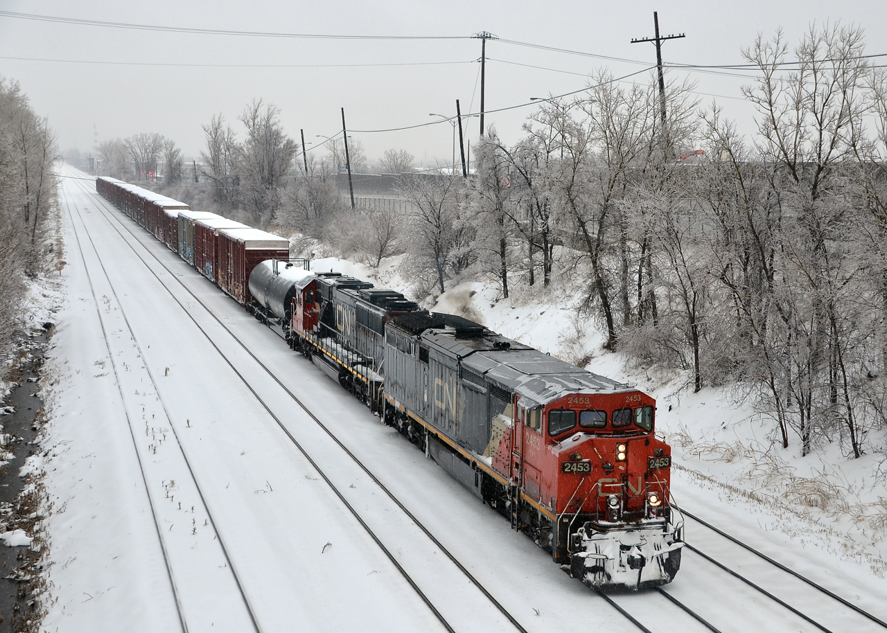 Caption: CN 527 heads towards nearby Taschereau Yard with CN 2453 & CN 5445 on a rainy and cold afternoon.