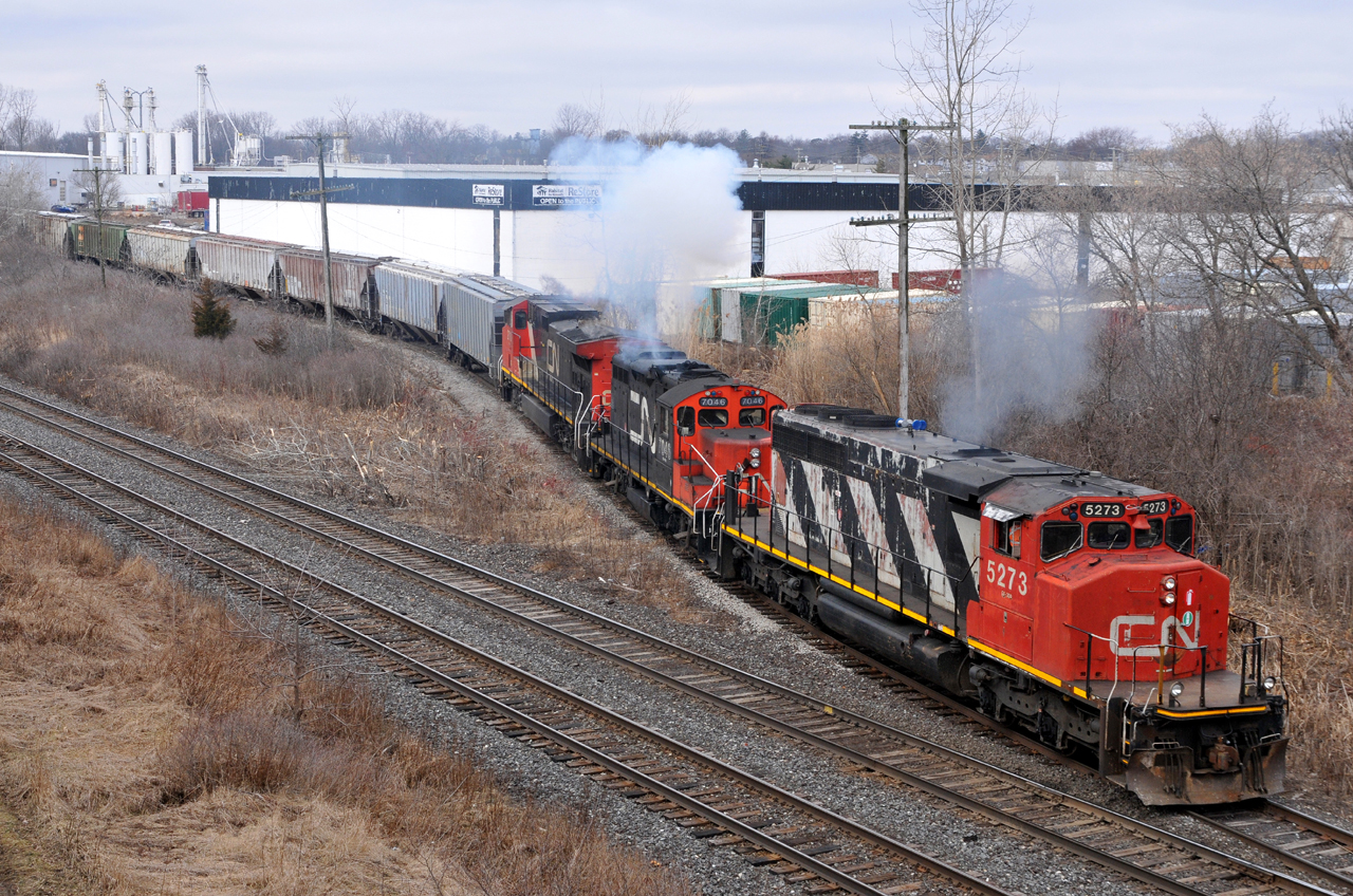 Phil, the only customer sidings that 6 axle power can be used on those Brantford assignments is Normerica (pictured) on the Dundas, Blastech in Cainsville, Nicholson & Cates in Caledonia, CGC and Mattice in Hagersville, Rembos and Mabe are the only two places where 6 axle power is not allowed due to curvature.