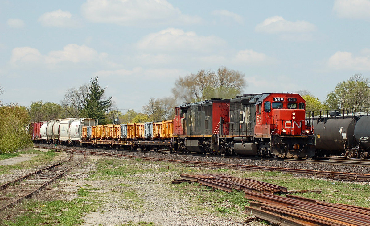 Caption: CN 6019 - CN 2441 lead an eastbound past Brantford