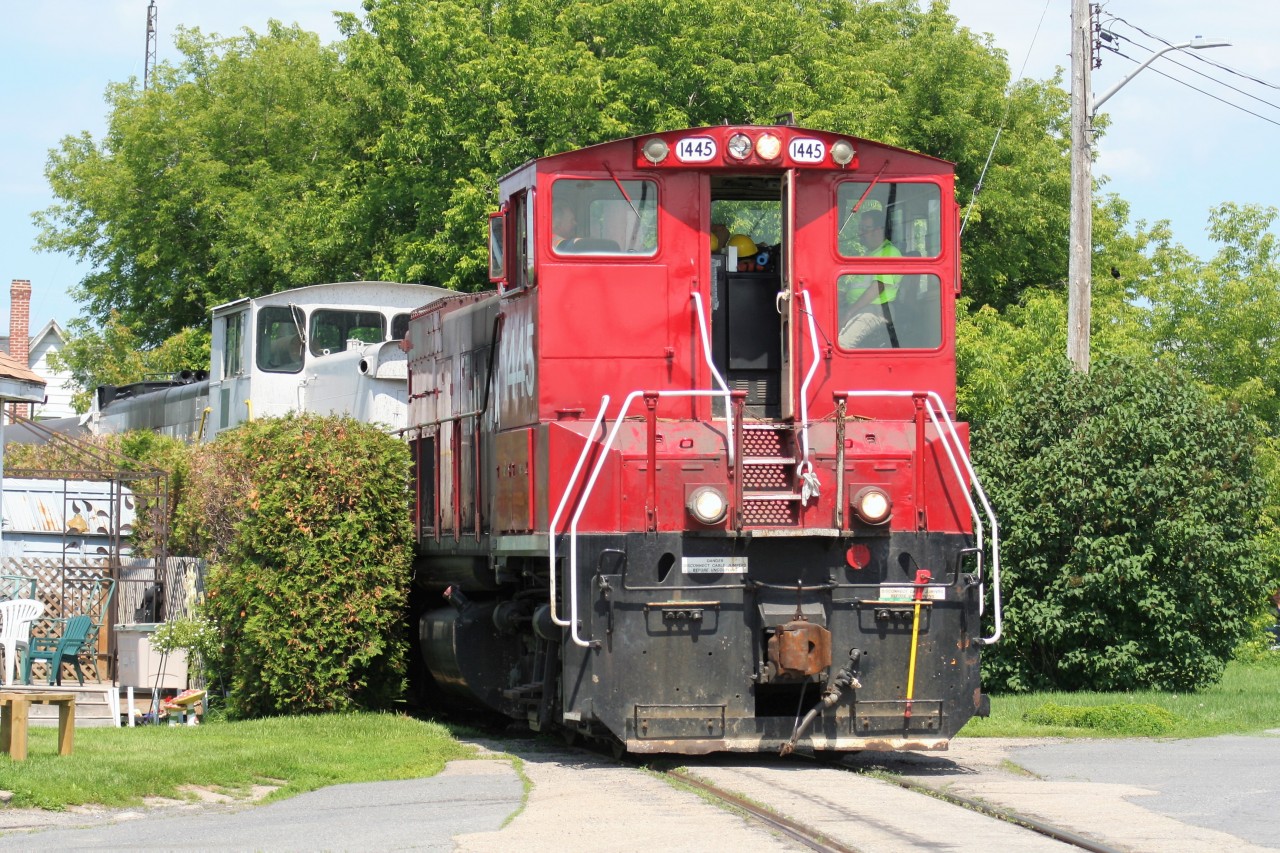 Caption: During June 2015, a friend and I ventured to the small eastern Ontario town of Cardinal. Here, Ingredion Canada operates a 1.5 mile industrial spur that connects its former Canada Starch Company (CASCO) facility to the CN Kingston Subdivision at mile 104.8. The Ingredion Canada railway crews make several daily runs between their small interchange with CN beside the Kingston Subdivision and the large plant. The spur offers some neat views as it meanders through Cardinal, crossing several streets and even running closely beside some businesses and houses. In the town, near the water tower and just north of Highway #2, Ingredion Canada has a three-track support yard where it stores cars. This yard is located between the interchange with CN and the Ingredion Canada facility. Helm Financial Corporation (HLCX) ex-Canadian Pacific MP15AC 1445 and ex-CN GMD-1 1105 are seen slowly rolling through Cardinal as they bring three tank cars to the Ingredion Canada plant.