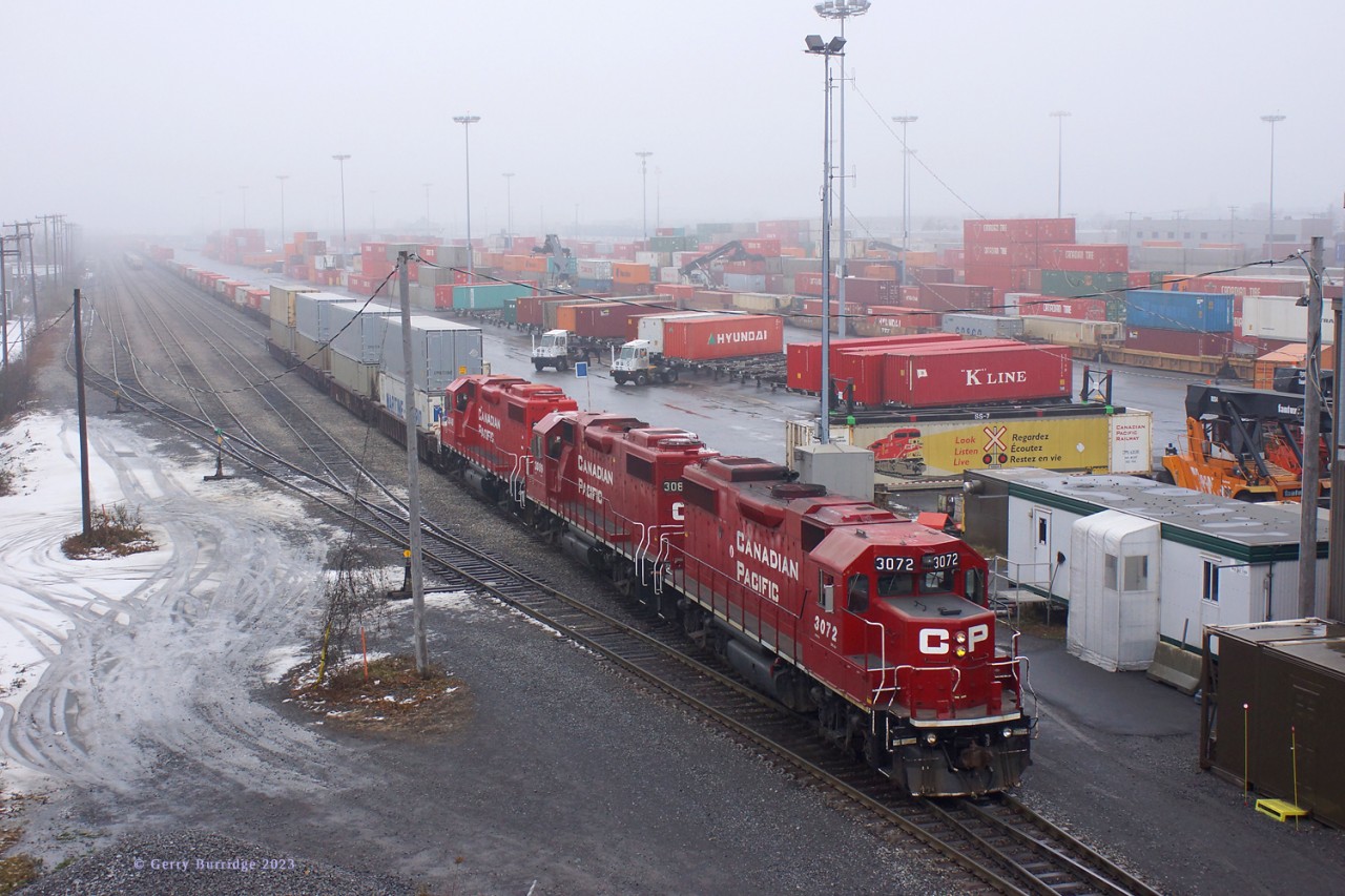 Caption: Under a mist-laden sky Canadian Pacific GP35s 3072+3089+3048 are working the intermodal yard at Lachine, Que.