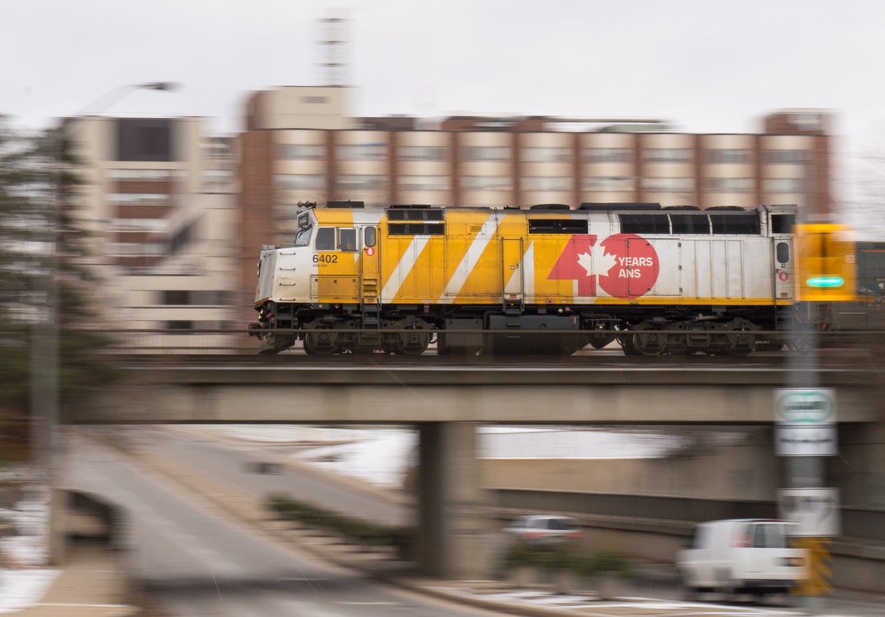 Caption: Via 6402 leads train 73 out of Brantford on its trip to Windsor.