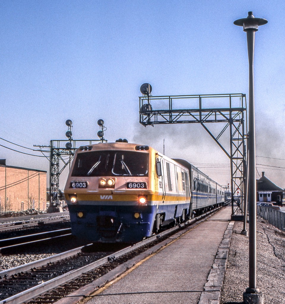 Caption: VIA 6903 has just passed the Burlington West station in Burlington, Ontario on March 26, 1984.