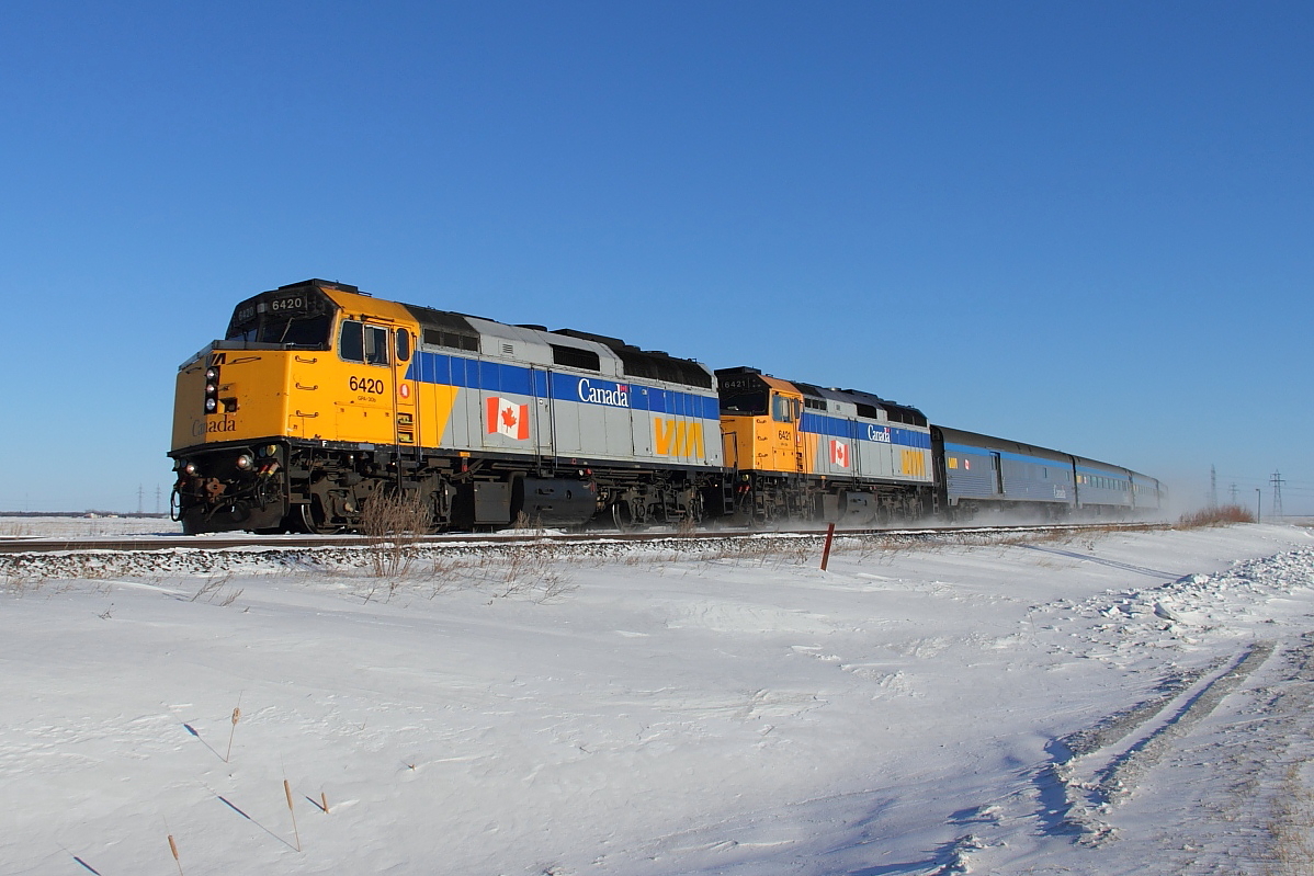 VIA's 693 Winnipeg to Churchill train heads out across the frozen prairie just west of Winnipeg.