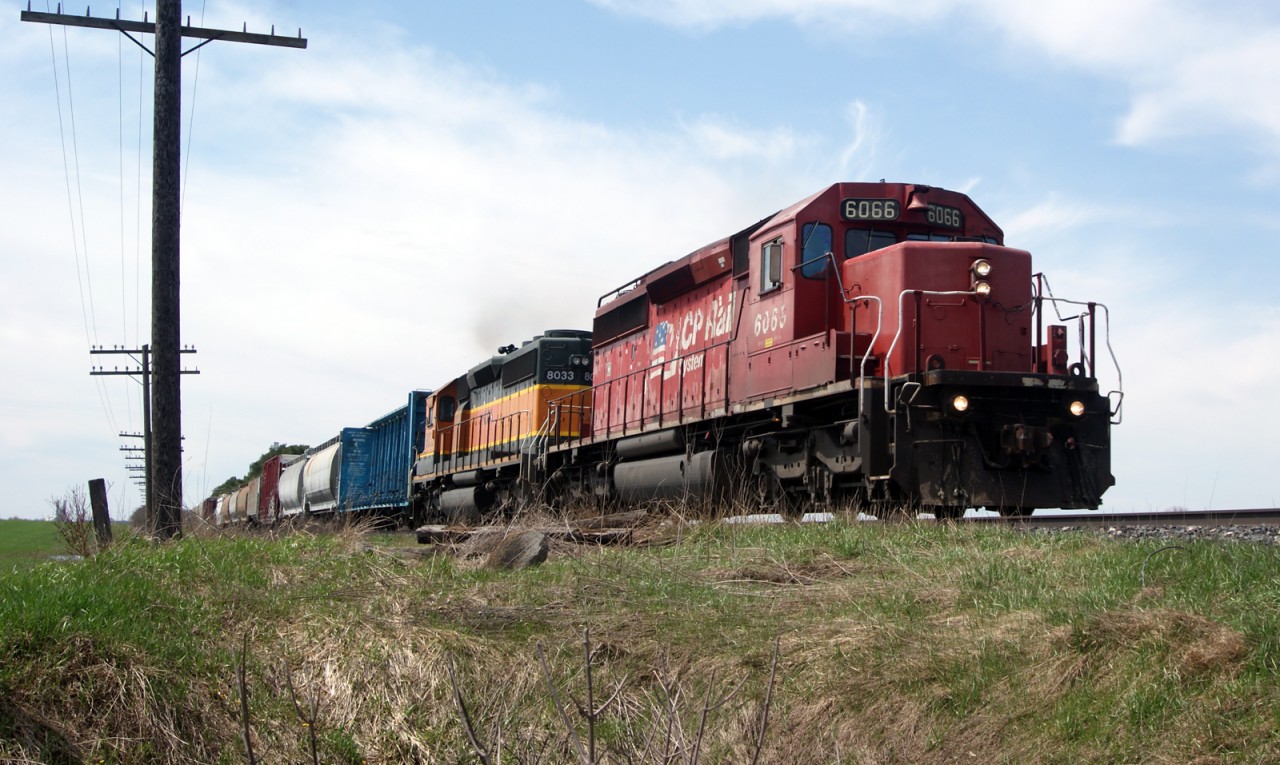 Caption: CPR Dual Flag image SD40-2 6066, leads a former BNSF, now Helm SD40-2 8033 on an eastbound manifest at the 43rd Line crossing, on the Galt Sub.