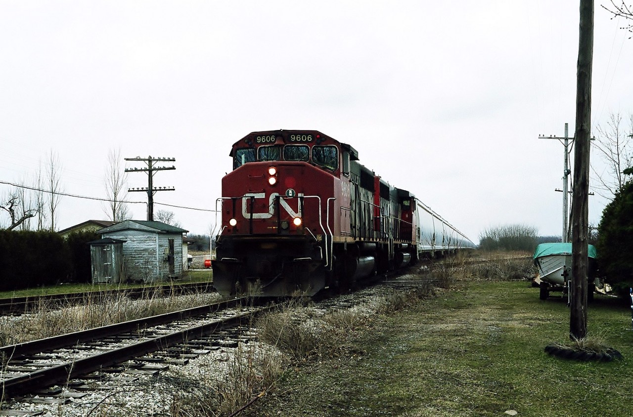 Used for the longest time, to store NCIX plastic pellet hoppers, the time had come. The final run to grab the hoppers so the rail could be removed. This was the run, a gloomy April day, no railfan hype, no fanfare. Just 2 CN GP's and a string of those hoppers. Appropriately 9606's class lights are on, normally for the end of a train, this time, the beginning of the end for the once great Canada Southern.
