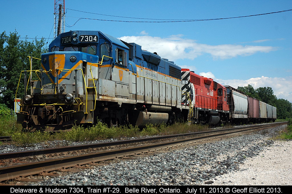 Caption: Delaware & Hudson GP38-2 #7304, living on borrowed time in this scheme, heads up train T-29 as it waits in the siding for an eastbound to pass before continuing it's trip back to Windsor.