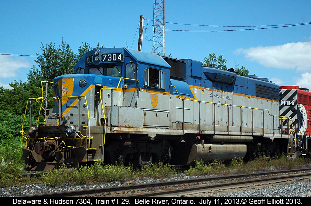 Caption: Delaware & Hudson GP38-2 #7304, living on borrowed time in this scheme, heads up train T-29 as it waits in the siding for an eastbound to pass before continuing it's trip back to Windsor.
