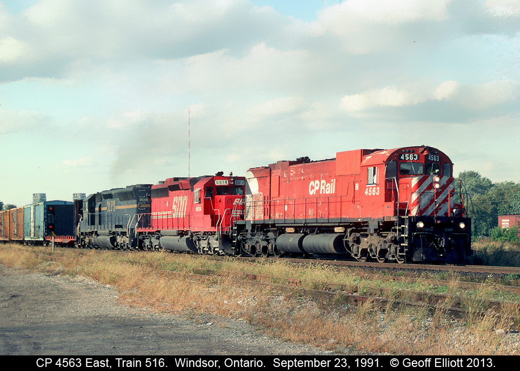 Caption: Quite the 'hodge-podge' of power on this train. M630 4563 leads a SOO SD40-2 and an MPI SD45 on tonight's 516 as it crests the summit at Windsor South after having passed through the Detroit River tunnel only minutes before.
