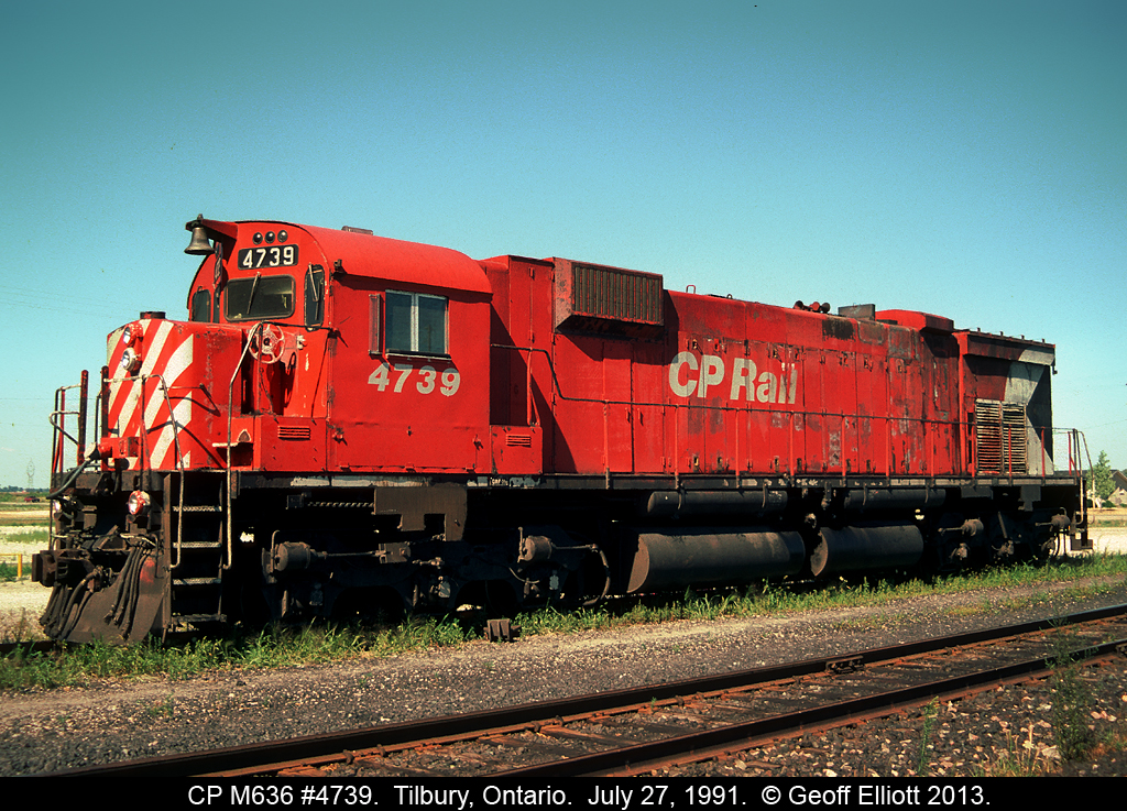 Caption: Having been setoff by an eastbound the day previous as a result of a traction motor fire, CP M636 #4739 sits patiently waiting for a maintenance crew to arrive to fix the unit to the point of being movable on to Toronto for full repairs.