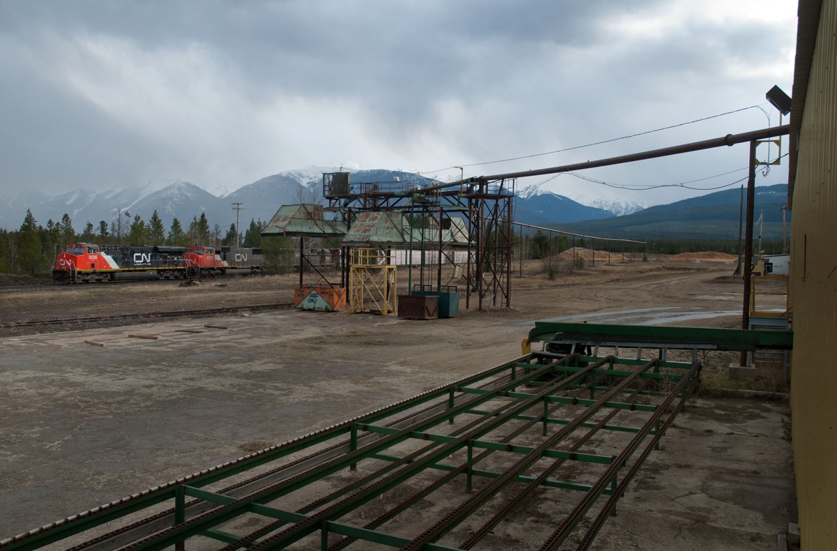 Caption: An eastbound CN passes the shutdown sawmill at Valemount.
