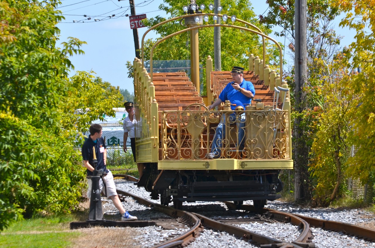 Caption: The Golden Chariot streetcar is heading to the Exporail's entrance to pick up passengers after the crew took a lunch break. Four of these fascinating streetcars were built for the Montreal Tramways company. Thankfully all have been preserved, including two at Exporail. One is on permanent display, while this one sees very occasional usage.