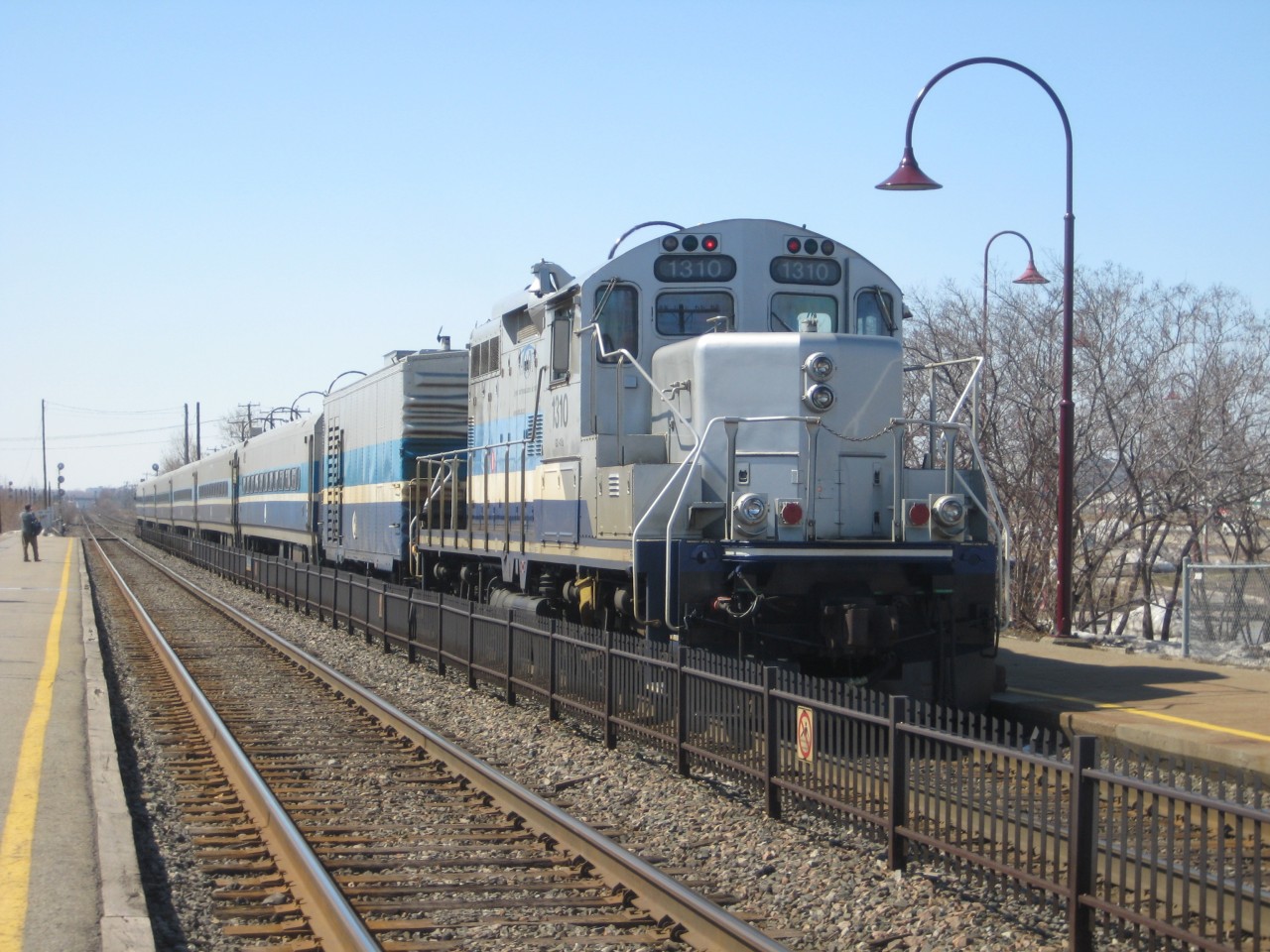 Caption: AMT 1310 (GP9) and AMT 605 (generator car) are at what is the rear end of this westbound commuter train, as the train is in push mode. The GP9 and generator car would be permanently out of AMT service by the end of 2009. The 700 series cars which are behind the generator car would be out of service for nearly three years, but have just started to reenter service during the past couple of weeks, freshly repainted and refurbished.