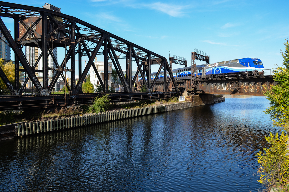 Caption: AMT 1365 is pushing a deadhead movement over the Lachine Canal, later the train will depart for the south shore on the Mont St-Hilaire line. The bridge to the left used to be CN's entry point to the Port of Montreal. It has been out of use about 20 years and is locked in place; CN accesses the Port of Montreal through a newer bridge a bit to the east. For more train photos, check out http://www.flickr.com/photos/mtlwestrailfan/