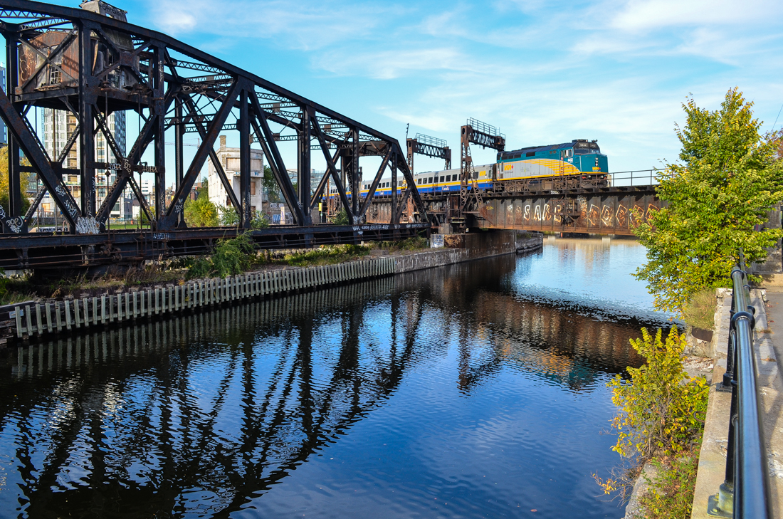 Caption: VIA 54 is about 20 minutes late as VIA 6452 pushes it over the Lachine Canal towards Centrl Station. The bridge to the left used to be CN's entry point to the Port of Montreal. It has been out of use about 20 years and is locked in place. CN accesses the Port of Montreal through a newer bridge a bit to the east. For more train photos, check out http://www.flickr.com/photos/mtlwestrailfan/