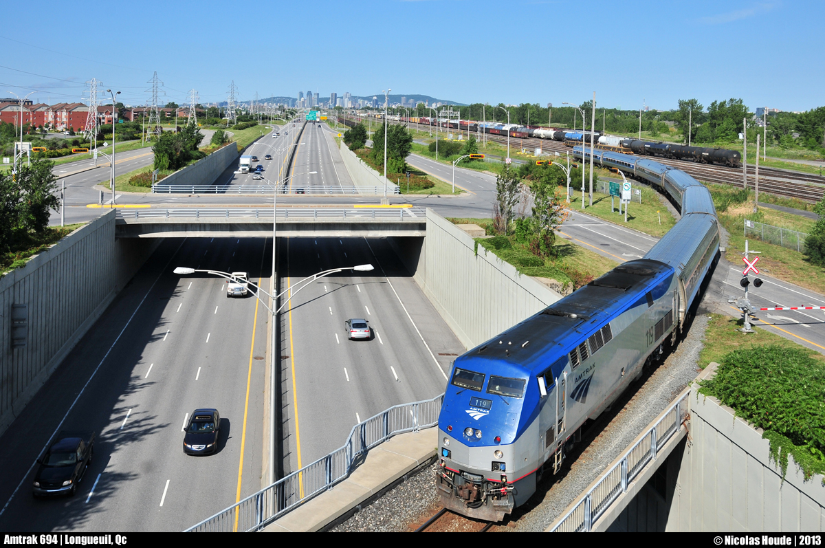 Caption: By a gorgeous morning, AMTRAK #694/68 (Montreal/New-York) cross the bridge over the highway 116 at Longueuil, QC. You can see the Montreal downtown in background, and the CN Southwark yard, in the right of the picture.