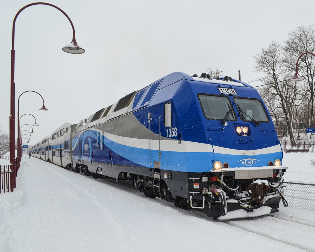 Caption: One of AMT's dual mode engines (operating in diesel mode only on this non-electrified line) leads a deadhead movement towards downtown Montreal. Pushing at the other end is another dual mode engine, AMT 1353. For more train photos, check out http://www.flickr.com/photos/mtlwestrailfan/