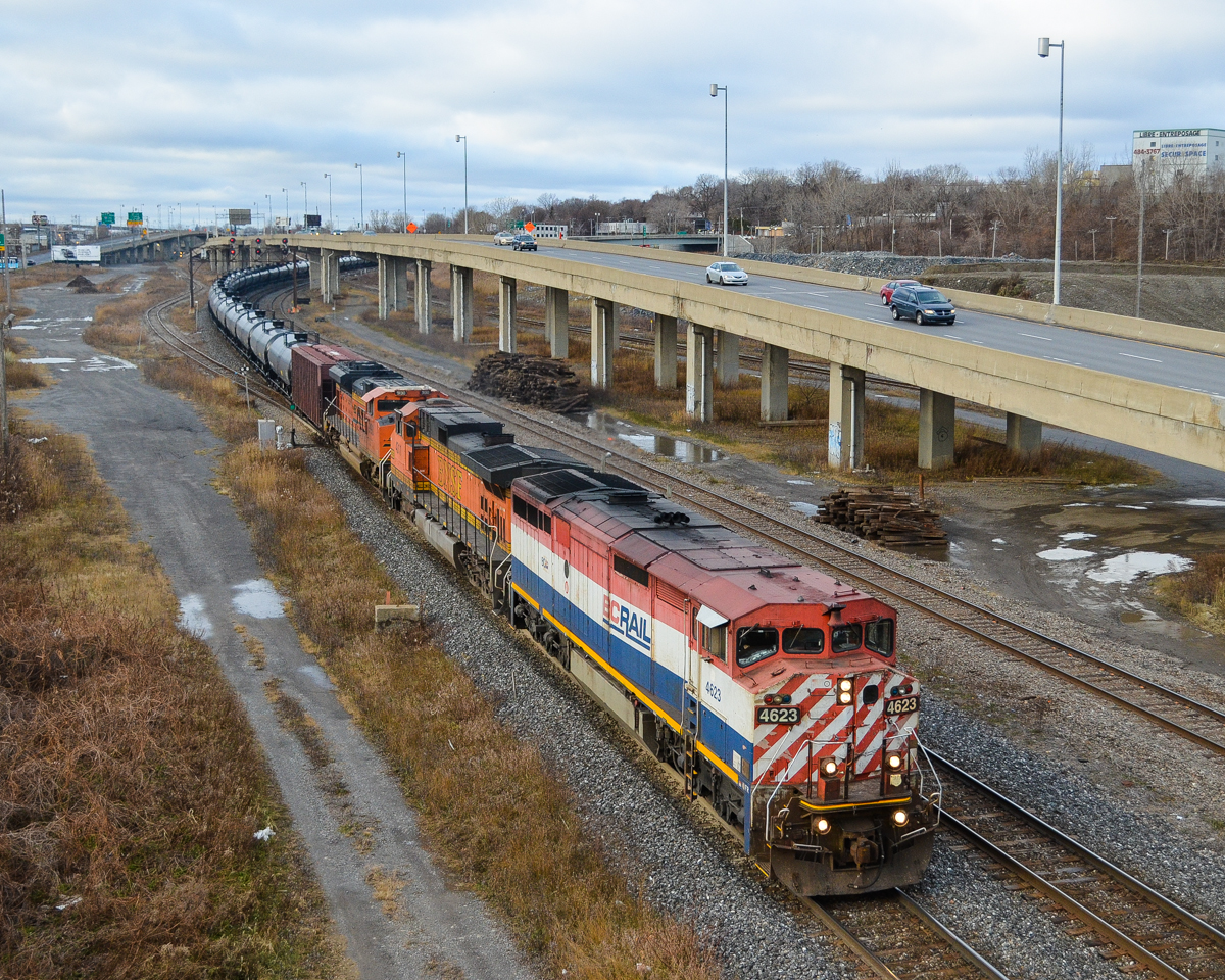 Caption: BNSF power a long way from home.... BCOL 4623, BNSF 4011 & BNSF 9190 are the power on a loaded oil train (CN 710) that is heading east after a crew change at Turcot West. Up until recently BNSF power was practically unheard of in Quebec, but is getting more common with the increase in oil trains. CN 710 originated in North Dakota and is bound for the Valero refinery in St-Romuald, Quebec (near Quebec City). For more train photos, check out http://www.flickr.com/photos/mtlwestrailfan/